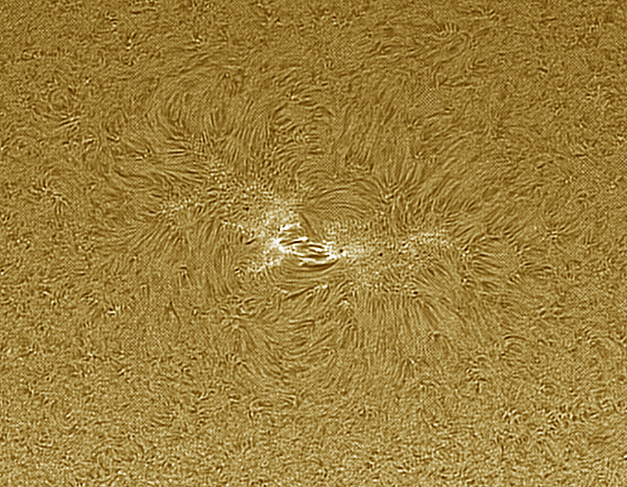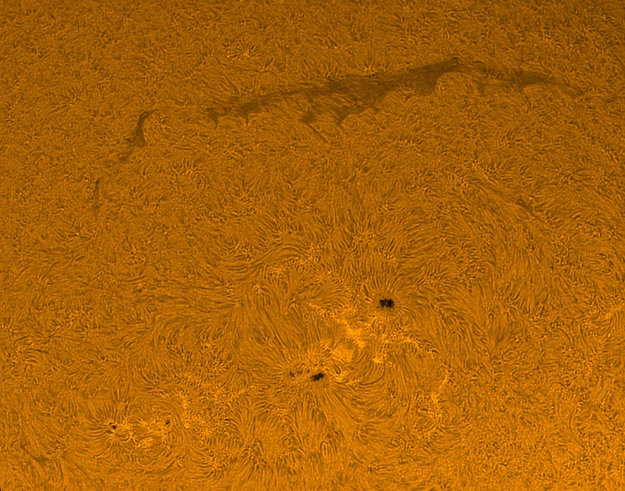 We zien zonnevlekken (donkere vlekken), een groot filament (donkere sliert) ter grootte van ongeveer de afstand van de aarde tot de maan en granulatie (de wirwar aan sliertjes en golven over het gehele oppervlak).